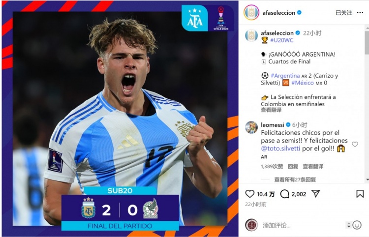 梅西社媒留言:祝贺阿根廷晋级世青赛四强,恭喜西尔维蒂进球