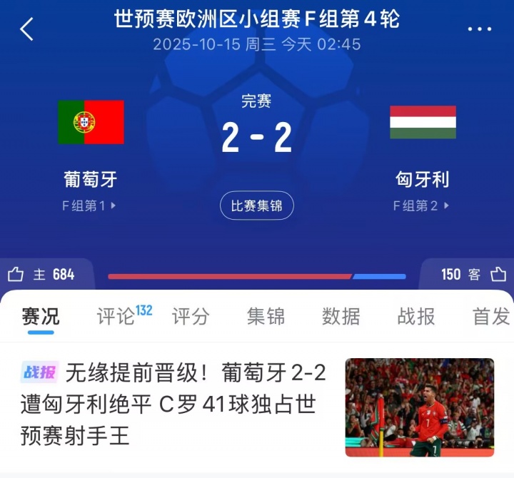2025年10月15日 错失提前晋级!葡萄牙2-2遭匈牙利绝平 C罗41球独占世预赛射手王