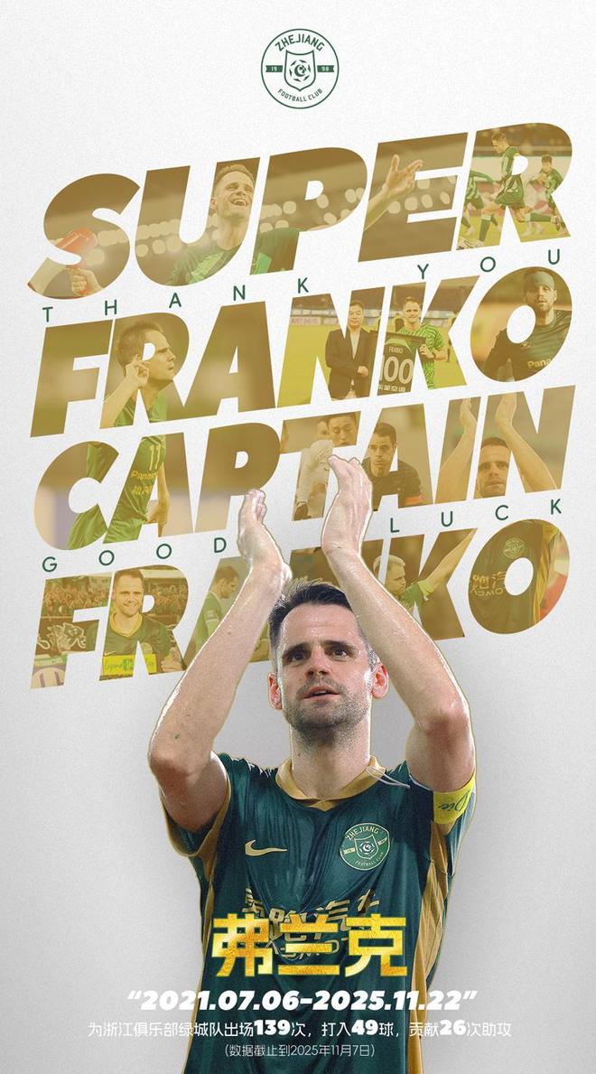 弗兰克代表浙江队出场139次,贡献49球+26次助攻。11月22日,中超收官战,浙江队将坐镇主场迎战青岛海牛,俱乐部将为弗兰克举办告别仪式。浙江队门将董春雨在社交媒体里发布视频向弗兰克告别:“浙江队传奇外援!高球商!高情商!榜样!队长,感谢你为我们团队所做的一切。”